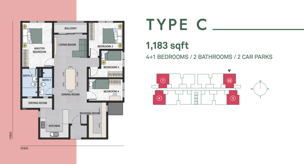 - Type C : 1,183 sqft (4+1 bilik, 2 bilik air) [Unit Terhad]