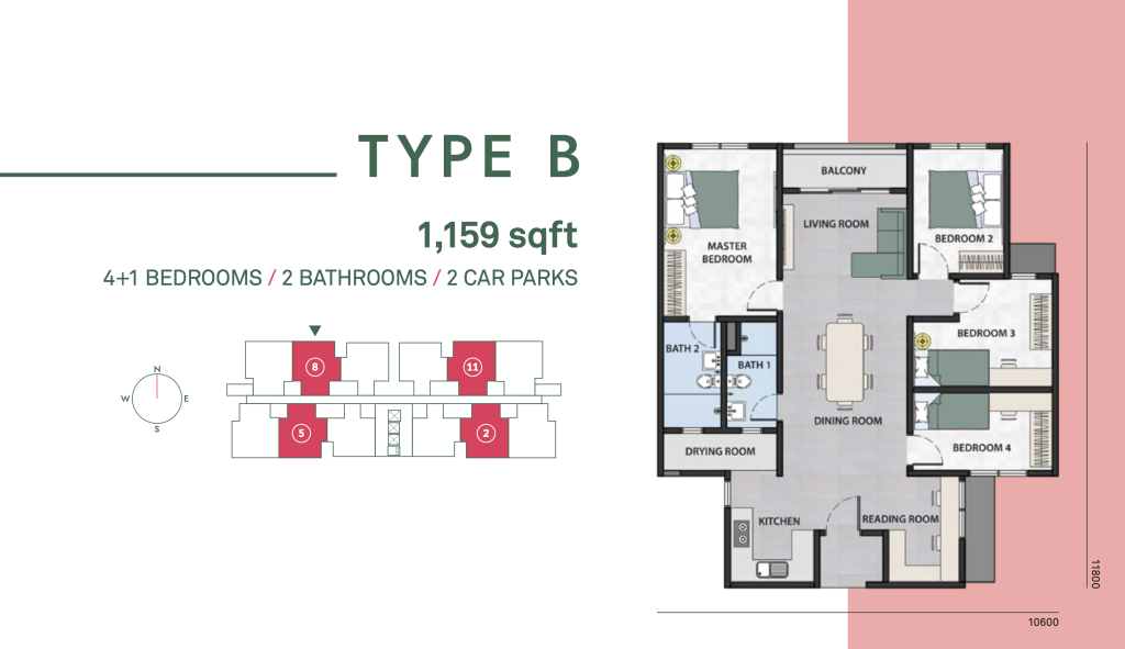 - Type B : 1,159 sqft (4+1 bilik, 2 bilik air) [Unit Terhad]